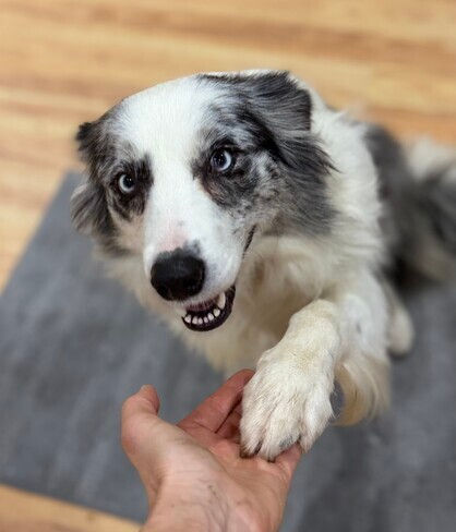 Jesse is crate-trained, sleeps quietly through the night, and does well when left alone. He is potty-trained, knows basic cues like “sit” and “no,” and is very food-motivated, making him receptive to training. Like many young herding dogs, Jesse can be nippy during play, and his foster family continues to work on appropriate play skills and redirection.